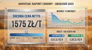 Na początku 2025 r. ceny Anvistaru były wyraźnie wyższe. W lutym i marcu średnia wynosiła około 1840 zł/t. Następnie w czerwcu stawki spadły w okolice 1600 zł/t. W listopadzie rynek zanotował lokalny dołek w pobliżu 1523 zł/t. W grudniu widać lekkie odbicie do około 1575 zł/t. Mimo to ceny nadal pozostają niższe niż w pierwszym kwartale 2025 r.