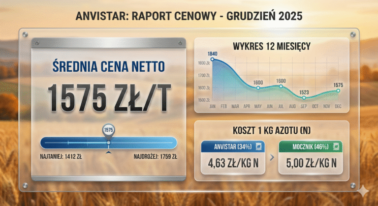 Anvistar to saletra amonowa o zawartości około 34% N. Średnia cena netto w grudniu 2025 r. wynosi 1575,40 zł/t. Dlatego warto przeliczyć koszt jednostkowy składnika pokarmowego. Koszt 1 kg czystego azotu wynosi około 4,63 zł (1575,40 / (34 × 10)).